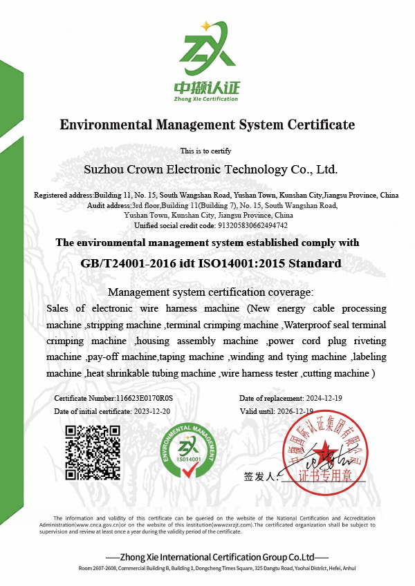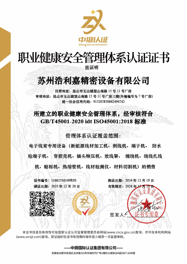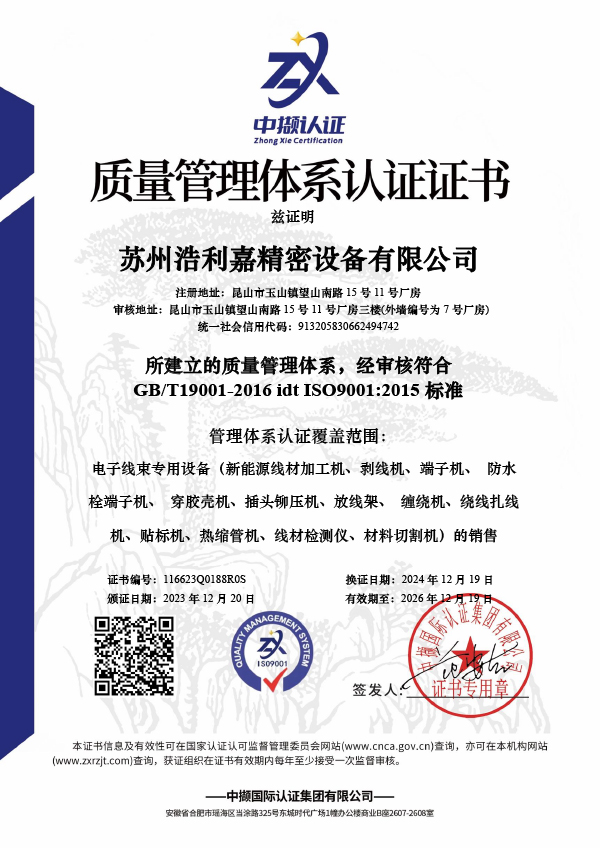 苏州浩利嘉精密设备有限公司成立于1998年,位于中国江苏省昆山市,是一家集研发,生产,销售为一体的现代化高科技企业。我公司已通过ISO9001国际质量体系认证和ISO14001环境管理体系认证,并全面实施6S现代企业管理。我公司严格执行日常生产经营根据ISO:9001质量标准,开发并生产了系列质量优良,性能稳定,效率高。主要产品包括全自动防水插头端子压接机,全自动塑料外壳端子压接机,全自动柔性扁平电缆端子压接机,光伏线自动化设备,新能源自动化线束处理设备以及各种端子压接机,计算机剥线机,导线贴标机,自动可视管道切割机,卷带机等相关产品。产品是广泛用于汽车,家用电器,通讯,轨道交通,核电,航空航天,充电桩,光伏和新能源行业。